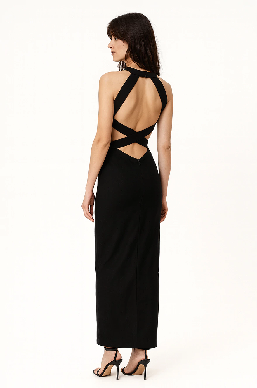 Vestido confeccionado en bengalina con spandex, de calidad premium. De escote halter y espalda protagonista. Diseñado para generar un ajuste y calce perfecto.