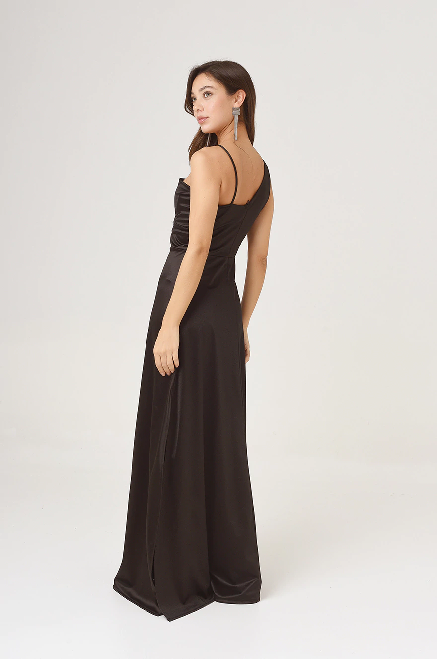 Vestido confeccionado en saten de punto con spandex. De falda amplia con abertura en el lateral que permite un mejor movimiento. Posee sustracciones en escote. Diseñado para generar un ajuste y calce perfecto.