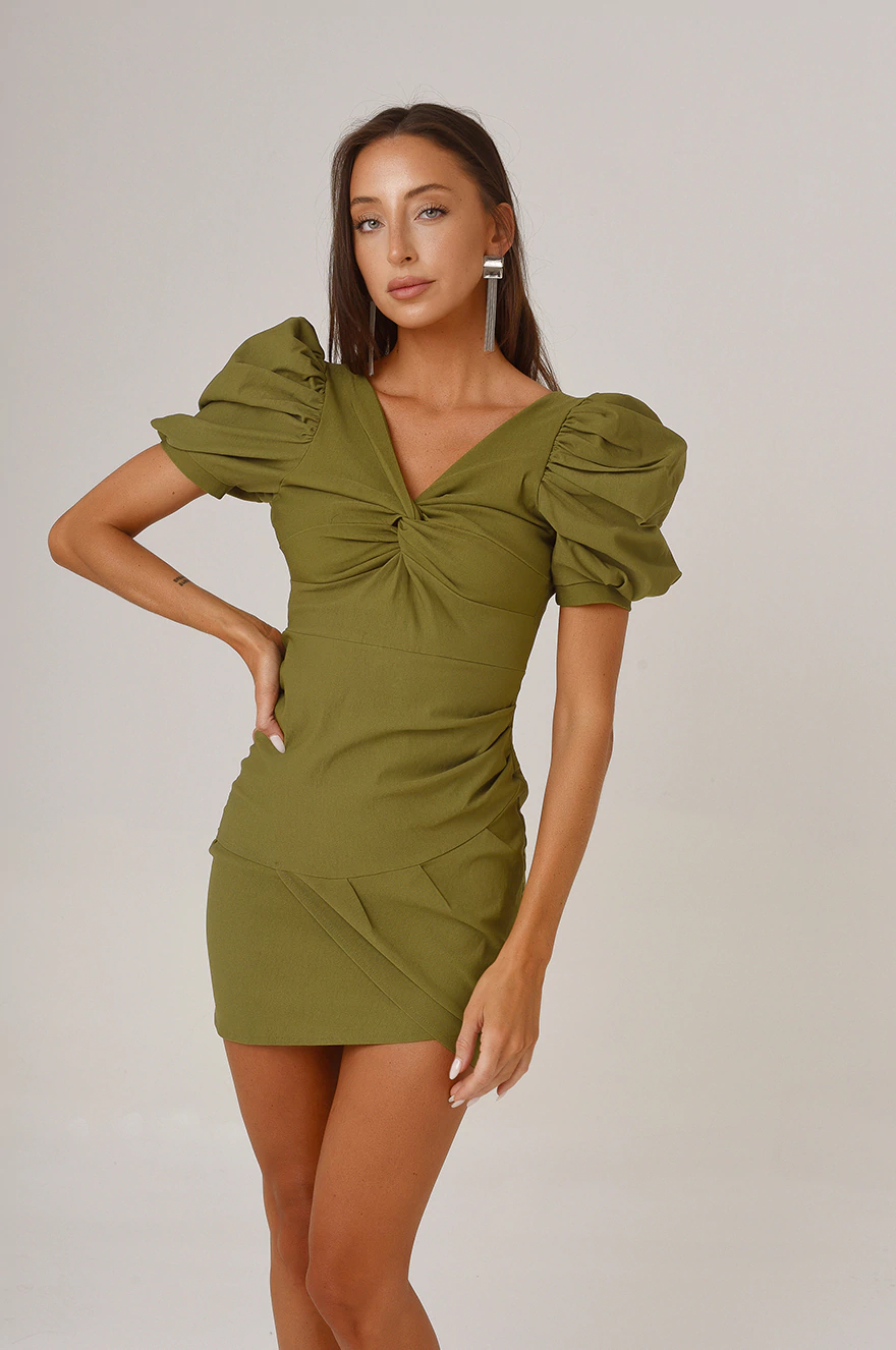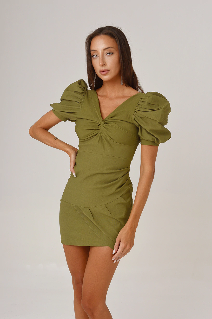 Vestido confeccionado en bengalina con spandex, de calidad premium. Posee manga abullonada. De espalda descubierta y se regula con lazo. Su falda con recortes y tablitas hace un calce y ajuste perfecto.