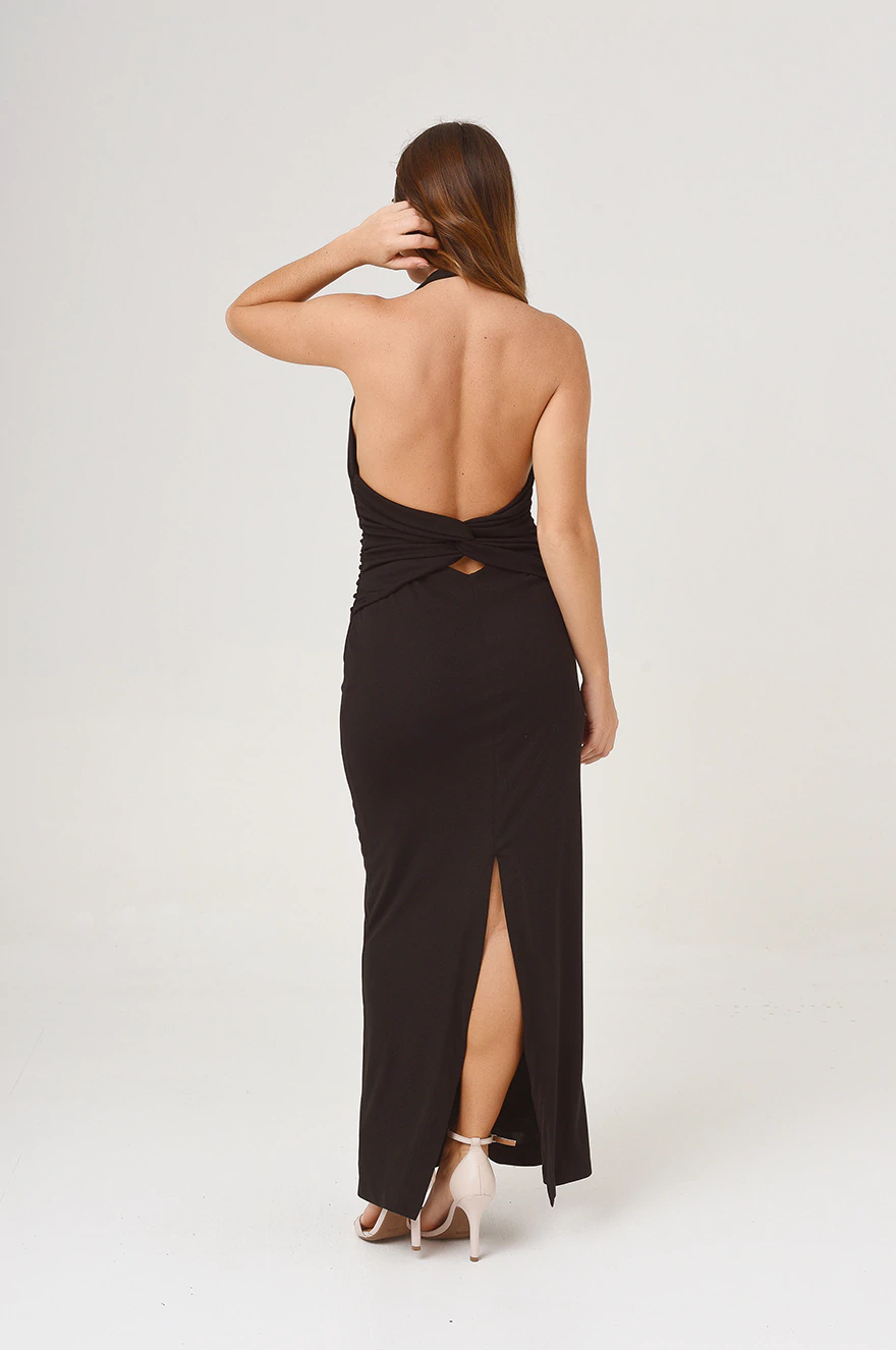Vestido confeccionado en crepe de punto con poco porcentaje de elasticidad. . Con escote halter y espalda descubierta.Posee moño torsado a la altura de la espalda, que hace que su espalda, sea aun más protagonista!