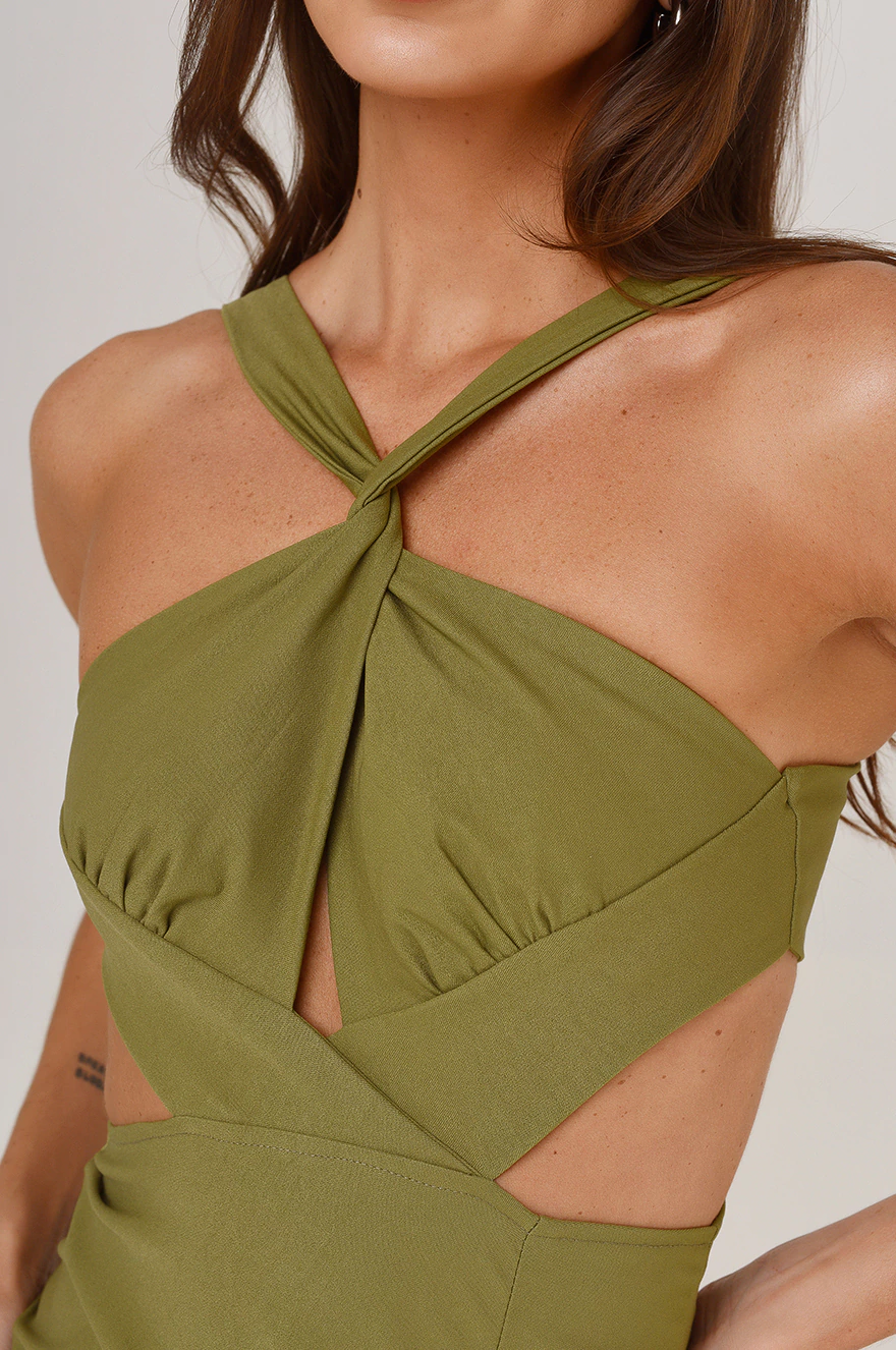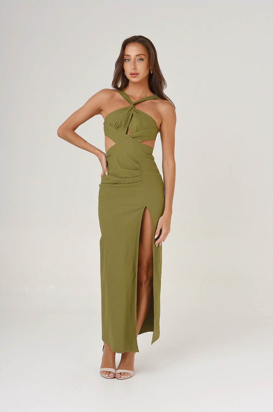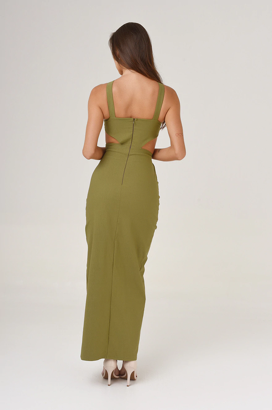 Vestido confeccionado en bengalina con spandex, de calidad premium . Diseñado con cutout y escote alto con abertura. Posee abertura en la delantera y acceso mediante cierre invisible en la esplada.
